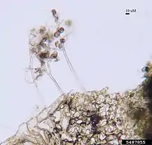 Les oospores résultent d'une reproduction sexuée et sont généralement produites dans les tissus foliaires internes. Elles peuvent se former à l'intérieur du mésophylle des feuilles et des tiges des rosiers infectés et peuvent servir de source d'inoculum pour de nouvelles infections[6]. Toutefois, le rôle des oospores dans la transmission de la maladie n'a pas été prouvé[7].