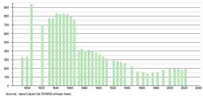 L'évolution du nombre d'habitants est connue à travers les recensements de la population effectués dans la commune depuis 1793. Pour les communes de moins de 10 000 habitants, une enquête de recensement portant sur toute la population est réalisée tous les cinq ans, les populations légales des années intermédiaires étant quant à elles estimées par interpolation ou extrapolation[29]. Pour la commune, le premier recensement exhaustif entrant dans le cadre du nouveau dispositif a été réalisé en 2006[30].