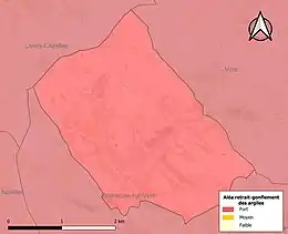 La commune est vulnérable au risque de mouvements de terrains constitué principalement du retrait-gonflement des sols argileux[20]. Cet aléa est susceptible d'engendrer des dommages importants aux bâtiments en cas d’alternance de périodes de sécheresse et de pluie. La totalité de la commune est en aléa moyen ou fort (76,3 % au niveau départemental et 48,5 % au niveau national). Sur les 52 bâtiments dénombrés sur la commune en 2019, 52 sont en aléa moyen ou fort, soit 100 %, à comparer aux 90 % au niveau départemental et 54 % au niveau national. Une cartographie de l'exposition du territoire national au retrait gonflement des sols argileux est disponible sur le site du BRGM[21],[Carte 3].