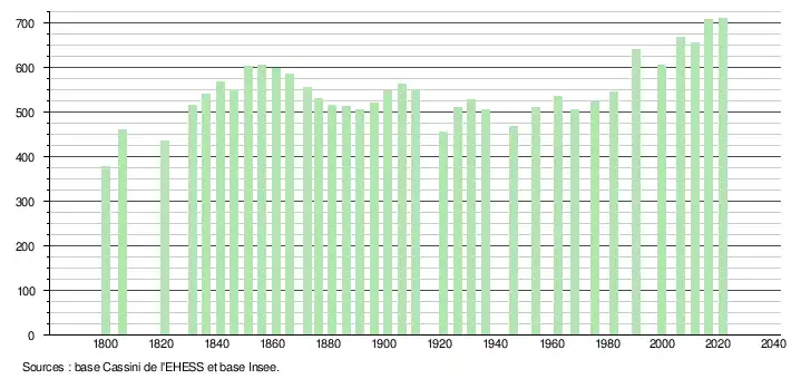 L'évolution du nombre d'habitants est connue à travers les recensements de la population effectués dans la commune depuis 1800. Pour les communes de moins de 10 000 habitants, une enquête de recensement portant sur toute la population est réalisée tous les cinq ans, les populations légales des années intermédiaires étant quant à elles estimées par interpolation ou extrapolation[23]. Pour la commune, le premier recensement exhaustif entrant dans le cadre du nouveau dispositif a été réalisé en 2006[24].