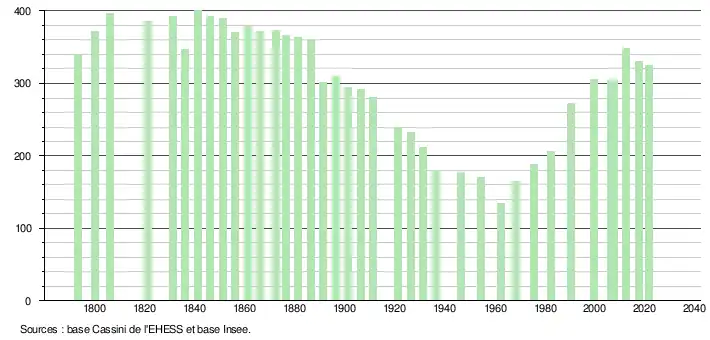 L'évolution du nombre d'habitants est connue à travers les recensements de la population effectués dans la commune depuis 1793. Pour les communes de moins de 10 000 habitants, une enquête de recensement portant sur toute la population est réalisée tous les cinq ans, les populations légales des années intermédiaires étant quant à elles estimées par interpolation ou extrapolation[18]. Pour la commune, le premier recensement exhaustif entrant dans le cadre du nouveau dispositif a été réalisé en 2007[19].