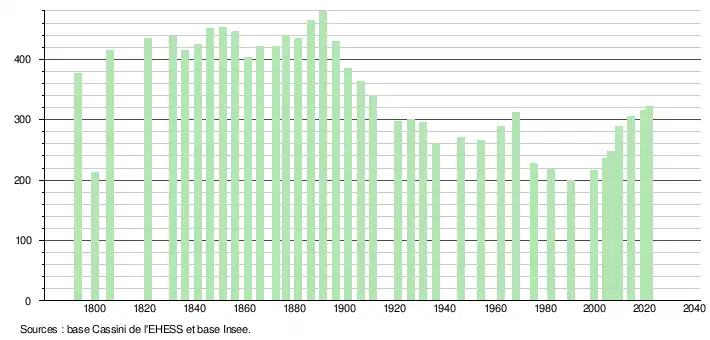 L'évolution du nombre d'habitants est connue à travers les recensements de la population effectués dans la commune depuis 1793. Pour les communes de moins de 10 000 habitants, une enquête de recensement portant sur toute la population est réalisée tous les cinq ans, les populations légales des années intermédiaires étant quant à elles estimées par interpolation ou extrapolation[13]. Pour la commune, le premier recensement exhaustif entrant dans le cadre du nouveau dispositif a été réalisé en 2004[14].