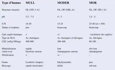 La matière organique se décompose plus ou moins rapidement selon le type d'humus. Dans un sol typique, près de 60 % de la matière organique est minéralisée en un an[17]. La vitesse de minéralisation dépend beaucoup des caractères de l'humus, essentiellement de son pH, de son humidité et de son contenu biologique (rapport C/N). Le mull, ou humus doux (pH compris entre 5,5 et 8,5 : mull calcique qui a un pH basique ou mull forestier faiblement acide) est caractérisé par un rapport C/N faible (entre 10 et 20), une litière peu épaisse et une matière organique composée essentiellement d'acides humiques. La minéralisation et nitrification rapides (80 % de la litière est dégradée en un an dans une forêt tempérée)[18] sont principalement l'œuvre de bactéries. Le moder (humus intermédiaire à pH compris entre 4 et 5) est caractérisé par un rapport C/N plus élevé (entre 15 et 25) et une matière organique composée d'acides fulviques et humiques. La minéralisation et nitrification lentes (80 % de la litière est dégradée en quatre ans)[19] sont principalement l'œuvre de champignons. Le mor ou humus brut (pH acide compris entre 3,5 et 5) est caractérisé par un rapport C/N très élevé (entre 25 et 40, parfois supérieur à 100) et une matière organique composée essentiellement d'acides fulviques (ne formant pas de complexe argilo-humique en raison de l'acidolyse[20] des argiles). La minéralisation et nitrification très lentes (80 % de la litière est dégradée en 15 à 20 ans)[21] sont principalement l'œuvre de champignons[22],[17],[23].