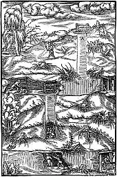Puits pour la recherche de silex, illustration de De Re Metallica, Agricola, 1556.
