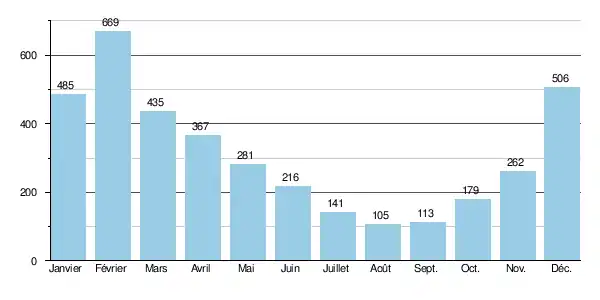 Sur la période d'observation de 9 ans, le débit mensuel minimal a été de 11,5 m3/s en - année de sécheresse mémorable sur l'Europe de l'ouest -, tandis que le débit mensuel maximal s'est élevé à 1 830 m3/s en .