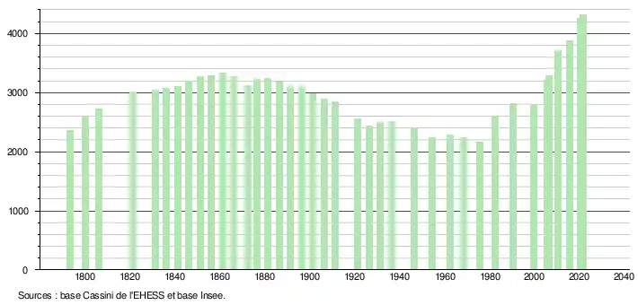 En 2021, la commune comptait 4 311 habitants[Note 4], en augmentation de 11,08 % par rapport à 2015 (Ille-et-Vilaine : +5,32 %, France hors Mayotte : +1,84 %).