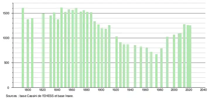 L'évolution du nombre d'habitants est connue à travers les recensements de la population effectués dans la commune depuis 1793. Pour les communes de moins de 10 000 habitants, une enquête de recensement portant sur toute la population est réalisée tous les cinq ans, les populations légales des années intermédiaires étant quant à elles estimées par interpolation ou extrapolation[29]. Pour la commune, le premier recensement exhaustif entrant dans le cadre du nouveau dispositif a été réalisé en 2008[30].