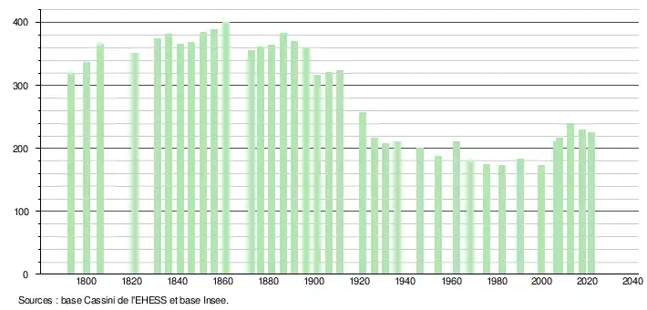 L'évolution du nombre d'habitants est connue à travers les recensements de la population effectués dans la commune depuis 1793. Pour les communes de moins de 10 000 habitants, une enquête de recensement portant sur toute la population est réalisée tous les cinq ans, les populations légales des années intermédiaires étant quant à elles estimées par interpolation ou extrapolation[26]. Pour la commune, le premier recensement exhaustif entrant dans le cadre du nouveau dispositif a été réalisé en 2007[27].