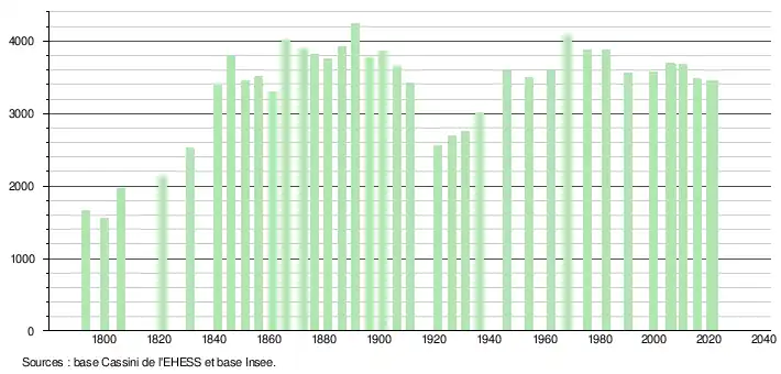 - Population municipale légale en vigueur au 1er janvier 2024, millésimée 2021, définie dans les limites territoriales en vigueur au 1er janvier 2023, date de référence statistique : 1er janvier 2021.