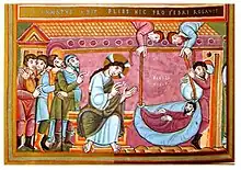 Dans le Roman de Lancelot du Lac , apparaît le Christ médecin, « Christus medicus » « « mire sans médecine », » guérissant les plaies de son regard et donne paix (qui se dit d'ailleurs « Mir » en autres langues) aux âmes par la confession; C’est déjà le personnage du Christus medicus (de)[31] le Christ médecin des âmes et des corps[32] dont témoignent les évangélistes, ayant comme remède, son corps et son sang, et les vertus théologales « crois seulement », popularisé plus tard en Suisse et en Allemagne par des représentations picturales, qui remet les péchés et relève le paralytique[33]…