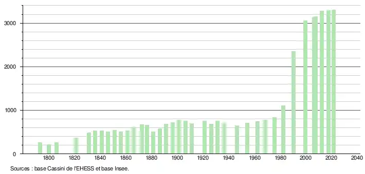 L'évolution du nombre d'habitants est connue à travers les recensements de la population effectués dans la commune depuis 1793. Pour les communes de moins de 10 000 habitants, une enquête de recensement portant sur toute la population est réalisée tous les cinq ans, les populations légales des années intermédiaires étant quant à elles estimées par interpolation ou extrapolation[42]. Pour la commune, le premier recensement exhaustif entrant dans le cadre du nouveau dispositif a été réalisé en 2007[43].