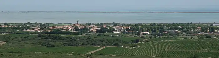 L'occupation des sols de la commune, telle qu'elle ressort de la base de données européenne d’occupation biophysique des sols Corine Land Cover (CLC), est marquée par l'importance des territoires agricoles (34,4 % en 2018), une proportion sensiblement équivalente à celle de 1990 (35,2 %). La répartition détaillée en 2018 est la suivante : milieux à végétation arbustive et/ou herbacée (33,5 %), zones agricoles hétérogènes (21,4 %), zones humides côtières (14 %), cultures permanentes (11,1 %), zones urbanisées (8,5 %), espaces verts artificialisés, non agricoles (6,9 %), mines, décharges et chantiers (2,5 %), prairies (1,9 %), eaux maritimes (0,2 %)[32]. L'évolution de l’occupation des sols de la commune et de ses infrastructures peut être observée sur les différentes représentations cartographiques du territoire : la carte de Cassini (XVIIIe siècle), la carte d'état-major (1820-1866) et les cartes ou photos aériennes de l'IGN pour la période actuelle (1950 à aujourd'hui)[Carte 1].