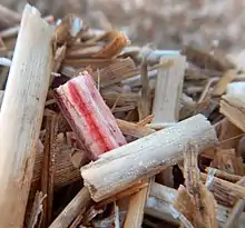 - Litière pour animaux de ferme ou domestique, paillage, ce débouché est le principal pour le miscanthus (52% de la production en 2022[15].Le miscanthus remplace avantageusement la paille car il a une meilleure capacité d'absorption ; il reste donc sec plus longtemps[16].