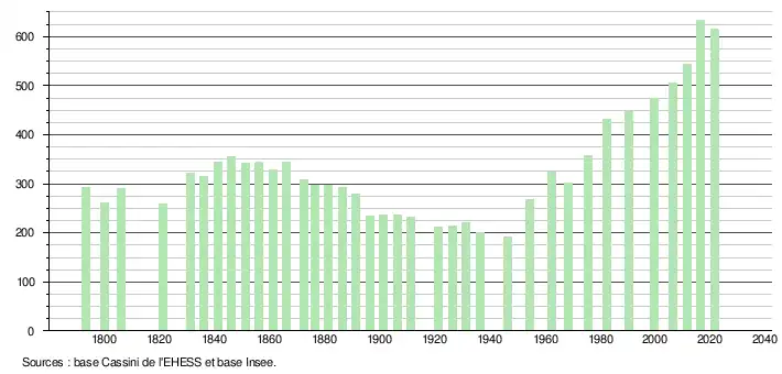L'évolution du nombre d'habitants est connue à travers les recensements de la population effectués dans la commune depuis 1793. Pour les communes de moins de 10 000 habitants, une enquête de recensement portant sur toute la population est réalisée tous les cinq ans, les populations légales des années intermédiaires étant quant à elles estimées par interpolation ou extrapolation[18]. Pour la commune, le premier recensement exhaustif entrant dans le cadre du nouveau dispositif a été réalisé en 2006[19].
