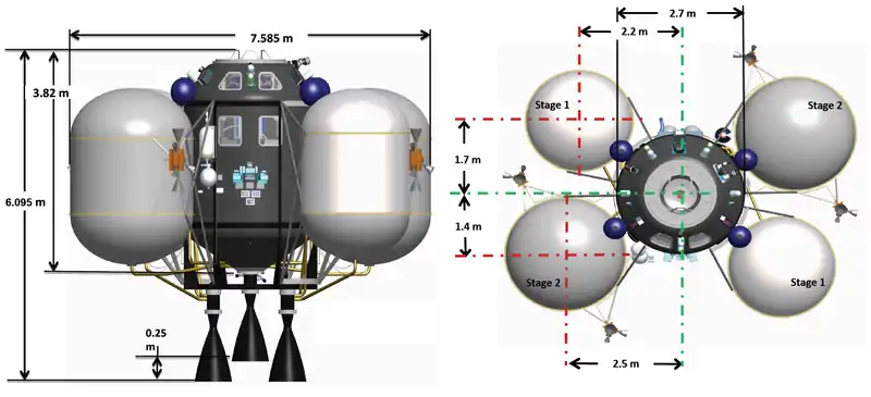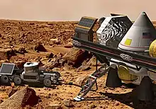 - un vaisseau équipé d'un étage de descente pour atteindre le sol martien, qui sert d'habitat à l'équipage sur Mars ;