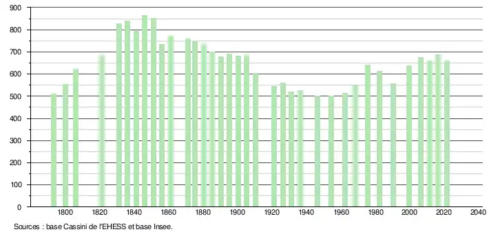 L'évolution du nombre d'habitants est connue à travers les recensements de la population effectués dans la commune depuis 1793. Pour les communes de moins de 10 000 habitants, une enquête de recensement portant sur toute la population est réalisée tous les cinq ans, les populations légales des années intermédiaires étant quant à elles estimées par interpolation ou extrapolation[18]. Pour la commune, le premier recensement exhaustif entrant dans le cadre du nouveau dispositif a été réalisé en 2006[19].