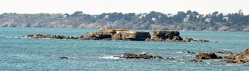 L'entrée de la ria de Brigneau vue depuis la rive ouest ; au premier plan, la jetée protégeant l'entrée de la ria.