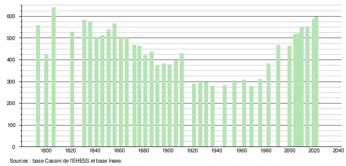 L'évolution du nombre d'habitants est connue à travers les recensements de la population effectués dans la commune depuis 1793. Pour les communes de moins de 10 000 habitants, une enquête de recensement portant sur toute la population est réalisée tous les cinq ans, les populations légales des années intermédiaires étant quant à elles estimées par interpolation ou extrapolation[26]. Pour la commune, le premier recensement exhaustif entrant dans le cadre du nouveau dispositif a été réalisé en 2004[27].