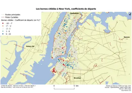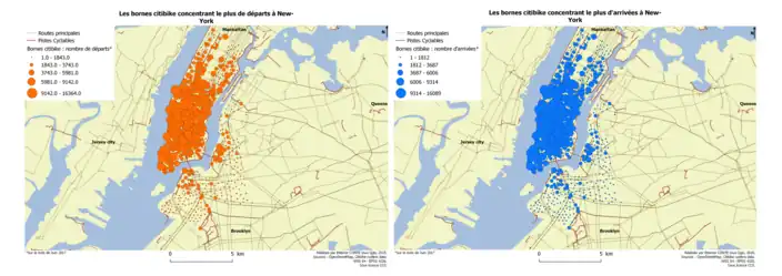 Citi Bike est une entreprise proposant des vélos dans la ville de New York à l'aide de bornes. Ils fournissent leurs données chaque mois en open data ce qui permet de les analyser et de les représenter. Les cartes qui suivent donnent un exemple de dynamiques territoriales pour une mobilité partagée (en l’occurrence les vélos) sur le mois de à New York.
