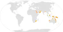 Elle est possiblement étendue dans les endroits suivants : Bahreïn ; Territoire britannique de l'océan Indien (archipel des Chagos) ; Brunei Darussalam ; Chine ; Ile Christmas ; Iles Cocos (Keeling) ; Comores ; Djibouti ; Guam ; Iran ; Irak ; Kenya ; Kuwait ; Madagascar ; Maldives ; Ile Maurice ; Mayotte ; Mozambique ; Myanmar ; Philippines ; Réunion ; Seychelles ; Singapour ; Somalie ; Sri Lanka ; Soudan ; Tanzanie ; Thaïlande ; Timor-Leste ; Viet Nam; Yémen[1].