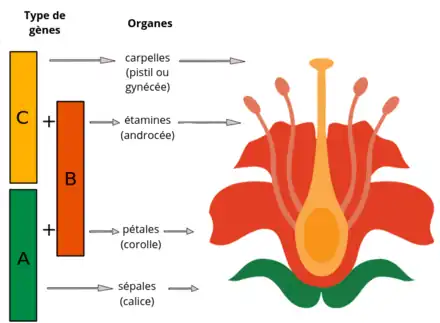 L'anatomie d'une fleur, définie par la présence d'une série d'organes (sépales, pétales, étamines et carpelles) positionnés selon un schéma donné, facilite la reproduction sexuée des Angiospermes. La fleur naît de l'activité de trois classes (ou types) de gènes, qui régulent le développement floral[8] :