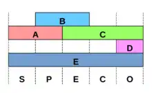 Modèle ABCDE[9] : S : sépales, P : pétales, E : étamines, C : carpelles, O : ovules.