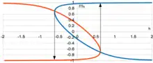 Lorsque l’on sort de ce domaine, cela conduit à passer au seul état d’équilibre, et donc à sauter d’une courbe à l’autre. Sur le graphique (Figure 2), cela revient au passage d’un minimum à un maximum, l'aimantation « tombe » dans ce qui était le deuxième minimum, et est devenu le seul minimum. Lors d’une montée ou une descente de (qui est proportionnel à ), la figure n’est donc pas la même : nous parlons de cycle d’hystérésis. Prenons en exemple le graphique ci-contre en partant de , en effectuant une montée jusqu’à , puis une redescente. Sur le graphique, nous partons d’en bas à gauche, nous nous déplaçons horizontalement vers la droite : le champ augmente, mais la direction d’aimantation ne varie presque pas (, ). Ensuite nous nous approchons du point d’inflexion où , et . La double dérivée passe négative, nous ne sommes plus sur un minimum d’énergie : nous sautons sur la courbe bleue à , et . Puis le champ augmente, sans variation de . Le même phénomène se répète dans la descende au niveau de l'inflexion de la courbe bleue.