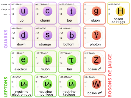 | Quark Top | t | 2/3 | rouge, vert, bleu | 171 GeV/c2 | 1/2 |