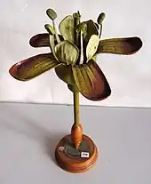 Chaque modèle est présenté sur un socle rond en bois, d'environ 15 cm de diamètre et 3 cm d'épaisseur[35]. Sur le socle est collée l'étiquette gris-vert du fabricant qui porte le numéro du catalogue, le nom scientifique de l'organisme représenté et sa famille, son nom vernaculaire en anglais, allemand, italien et français, l'organe représenté et son grandissement[32],[42]. La couleur du socle, en bois naturel clair verni pour les modèles les plus anciens, ou peint en noir pour les modèles datant du début du XXe siècle[43],[23], et l'étiquette permettent d'identifier les différentes séries de modèles et de les dater[44]. Certains exemplaires sont également pourvus d'une plaque en métal argenté en haut-relief, qui porte l'adresse de l'entreprise. Habituellement, le modèle est porté par une tige cylindrique en rotin, fichée dans une toupie creuse fixée au socle[45],[35]. Un socle peut supporter des éléments portés par différentes tiges[46], mais une même plante peut aussi être représentée par plusieurs éléments sur des socles distincts[27].