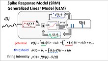 Le modèle de neurone d'intégration-et-tir avec fuite prend en compte les fuites du neurone mais ne tient toujours pas compte de l'adaptation neuronale, de sorte qu'il ne peut pas décrire un train d'impulsions mesuré expérimentalement en réponse à un courant d'entrée constant[15]. Cet inconvénient est supprimé dans les modèles d'intégration-et-tir généralisés qui contiennent également une ou plusieurs variables d'adaptation et sont capables de prédire les temps des potentiels d'actions des neurones corticaux sous injection de courant avec un degré de précision élevé[16],[17],[18].