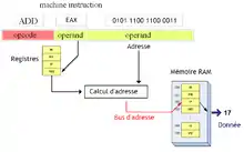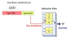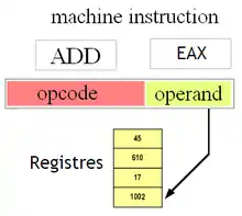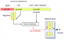 De nombreuses instructions font référence à des données se trouvant à différents endroits de la machine : registres, pile d'exécution, mémoire statique, mémoire dynamique (tas), ports d'E/S.