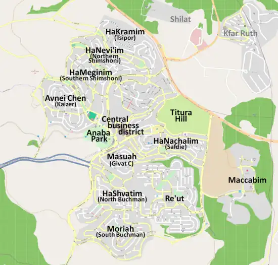 Une partie de la ville (le quartier Maccabim) n'est pas reconnue par l'Union européenne comme étant en Israël, car elle se trouve dans ce que l'accord d'armistice de 1949 avec la Jordanie a laissé comme no man's land et a été occupée en 1967 par Israël avec la Cisjordanie proprement dite[2],[3].