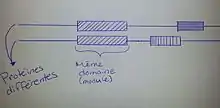 - Tout d'abord, le cas où tous les domaines sont des modules. Certains modules peuvent être homologues, mais la protéine ne l'est pas dans tous les cas. Voici une image pour aider à visualiser ce concept[11].