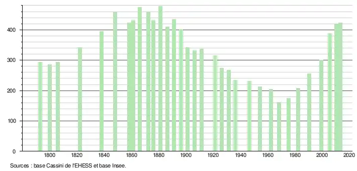 L'évolution du nombre d'habitants est connue à travers les recensements de la population effectués dans la commune depuis 1793. À partir du , les populations légales des communes sont publiées annuellement dans le cadre d'un recensement qui repose désormais sur une collecte d'information annuelle, concernant successivement tous les territoires communaux au cours d'une période de cinq ans. Pour les communes de moins de 10 000 habitants, une enquête de recensement portant sur toute la population est réalisée tous les cinq ans, les populations légales des années intermédiaires étant quant à elles estimées par interpolation ou extrapolation[6]. Pour la commune, le premier recensement exhaustif entrant dans le cadre du nouveau dispositif a été réalisé en 2005[7],[Note 2].
