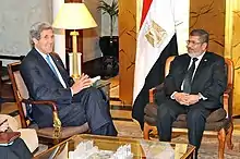 Le , le général Abdel Fattah al-Sissi, chef d'état-major de l'armée égyptienne, annonce la destitution de Mohamed Morsi et le remplacement de celui-ci par le président de la Haute Cour constitutionnelle, Adli Mansour, ainsi que la suspension de la Constitution, ajoutant vouloir donner plus de pouvoirs aux jeunes[34]. Mohamed Morsi dénonce un « coup d'État complet » sur sa page Twitter[35]. L'armée annonce qu'elle organisera des élections législatives et présidentielle anticipées. Al-Sissi déclarera plus tard que « l'armée avait agi après le refus de Morsi d'organiser un référendum sur son maintien au pouvoir »[36],[37].
