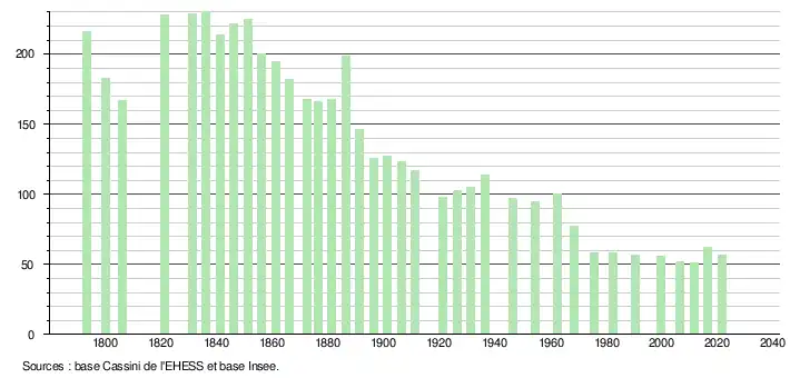 L'évolution du nombre d'habitants est connue à travers les recensements de la population effectués dans la commune depuis 1793. Pour les communes de moins de 10 000 habitants, une enquête de recensement portant sur toute la population est réalisée tous les cinq ans, les populations légales des années intermédiaires étant quant à elles estimées par interpolation ou extrapolation[20]. Pour la commune, le premier recensement exhaustif entrant dans le cadre du nouveau dispositif a été réalisé en 2006[21].