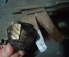 Après la diffusion des différentes couches, la billette est coupée au ciseau pour révéler les couches internes, puis aplatie. Cette découpe et cet aplatissage sont ensuite répétés de multiples fois pour développer les motifs caractéristiques du mokume[3].