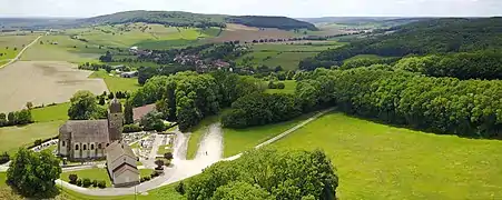 L'église de Laître, le village de Molay en contrebas et la montagne de La Roche en arrière-plan.