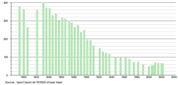 L'évolution du nombre d'habitants est connue à travers les recensements de la population effectués dans la commune depuis 1793. Pour les communes de moins de 10 000 habitants, une enquête de recensement portant sur toute la population est réalisée tous les cinq ans, les populations légales des années intermédiaires étant quant à elles estimées par interpolation ou extrapolation[40]. Pour la commune, le premier recensement exhaustif entrant dans le cadre du nouveau dispositif a été réalisé en 2004[41].
