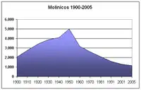 Molinicos compte 1060 habitants (2010). La commune s'est agrandie de 144 km2 et la population s'est distribuée entre le noyau principal et les nombreux districts[1],[2].