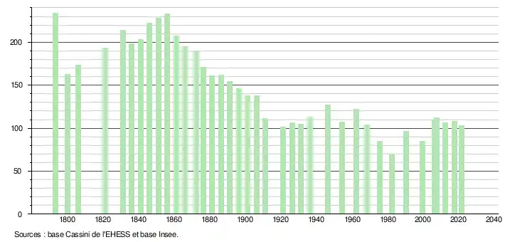 L'évolution du nombre d'habitants est connue à travers les recensements de la population effectués dans la commune depuis 1793. Pour les communes de moins de 10 000 habitants, une enquête de recensement portant sur toute la population est réalisée tous les cinq ans, les populations légales des années intermédiaires étant quant à elles estimées par interpolation ou extrapolation[16]. Pour la commune, le premier recensement exhaustif entrant dans le cadre du nouveau dispositif a été réalisé en 2007[17].