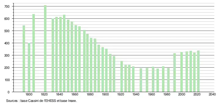 L'évolution du nombre d'habitants est connue à travers les recensements de la population effectués dans la commune depuis 1793. Pour les communes de moins de 10 000 habitants, une enquête de recensement portant sur toute la population est réalisée tous les cinq ans, les populations légales des années intermédiaires étant quant à elles estimées par interpolation ou extrapolation[24]. Pour la commune, le premier recensement exhaustif entrant dans le cadre du nouveau dispositif a été réalisé en 2006[25].