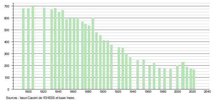 L'évolution du nombre d'habitants est connue à travers les recensements de la population effectués dans la commune depuis 1793. Pour les communes de moins de 10 000 habitants, une enquête de recensement portant sur toute la population est réalisée tous les cinq ans, les populations légales des années intermédiaires étant quant à elles estimées par interpolation ou extrapolation[15]. Pour la commune, le premier recensement exhaustif entrant dans le cadre du nouveau dispositif a été réalisé en 2007[16].