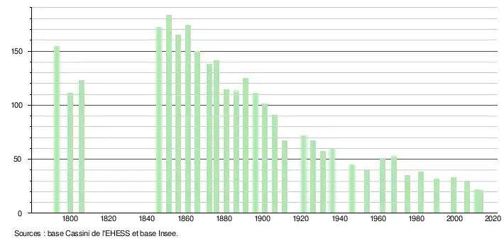 L'évolution du nombre d'habitants est connue à travers les recensements de la population effectués dans la commune depuis 1793. À partir du , les populations légales des communes sont publiées annuellement dans le cadre d'un recensement qui repose désormais sur une collecte d'information annuelle, concernant successivement tous les territoires communaux au cours d'une période de cinq ans. Pour les communes de moins de 10 000 habitants, une enquête de recensement portant sur toute la population est réalisée tous les cinq ans, les populations légales des années intermédiaires étant quant à elles estimées par interpolation ou extrapolation[4]. Pour la commune, le premier recensement exhaustif entrant dans le cadre du nouveau dispositif a été réalisé en 2006[5],[Note 1].
