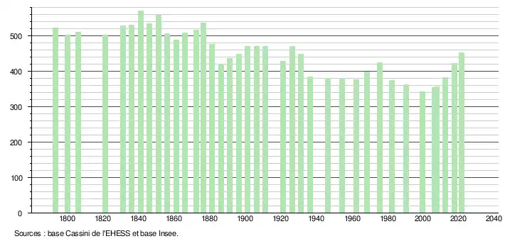L'évolution du nombre d'habitants est connue à travers les recensements de la population effectués dans la commune depuis 1793. Pour les communes de moins de 10 000 habitants, une enquête de recensement portant sur toute la population est réalisée tous les cinq ans, les populations légales des années intermédiaires étant quant à elles estimées par interpolation ou extrapolation[22]. Pour la commune, le premier recensement exhaustif entrant dans le cadre du nouveau dispositif a été réalisé en 2007[23].