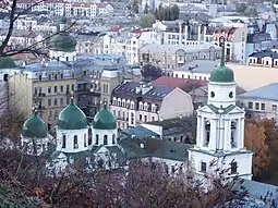 Sur la moitié gauche de cette vue de Podil au xixe siècle, le monastère avec sa clôture montant toute la colline de Zamkova Hora jusqu'à l'église de la Trinité (détruite).