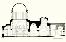 Boúras émet également une hypothèse selon laquelle la forme quadratique de la base de la voûte serait due aux besoins particuliers de la liturgie d’une église monastique. Cette hypothèse a cependant été mise en doute par Robert Ousterhout qui voit dans la forme octogonale du dôme et la transition vers une base carrée une influence de l’architecture arabe, comme le démontrent plusieurs édifices du XIe siècle dans les régions d’Assouan et d’Alep[15]. La présence de nombreuses ambassades entre le monde byzantin et le monde arabe aurait permis certains contacts et, par la même, l’échange de savoirs en matière d’architecture[15].