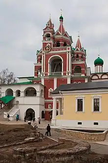 Au nord du monastère la cour de réception du monastère est fermée par un campanile de forme étonnante. L'édifice est formé de deux tours latérales et d'une grande tour centrale. Le toit est en forme de tente pyramidale. Sur la tour centrale se trouve une horloge et au dessus de celle-ci une petite tour avec couverture pyramidale elle-aussi. L'ensemble forme un tout insolite. À l'est de ce campanile se trouve l'église de la Transfiguration. Elle est surmontée d'un dôme de couleur verte. Cette église date de la même époque que les autres bâtiments c'est-à-dire 1650. Mais elle a été remaniée en 1690 dans l'esprit du baroque Narychkine[9].