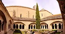 Le cloître roman est un petit chef-d'œuvre de grâce et de simplicité ; le réfectoire, couvert de deux voûtes d'ogives, et la salle des moines ont été restaurés, alors que les autres bâtiments qui l'entouraient sont en ruine. C'est le seul cloître roman à subsister pour le département[25] ; son angle sud-est est relevé entre 1895 et 1905. Il ouvre par deux arcs larges et deux baies géminées sur chaque côté. Les chapiteaux sont ornés de bâtons brisés et de feuilles stylisées et sculptées à plat, l’un de masques humains. Le cloître est aussi orné d’animaux et, sur une colonne, d’un personnage debout et droit : peut être un abbé ou un saint[26].