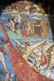 La voûte du pronaos représente la vierge entourée d'anges et de prophètes. Au-dessus de la porte donnant sur la chambre des tombeaux la dormition de la Vierge.
